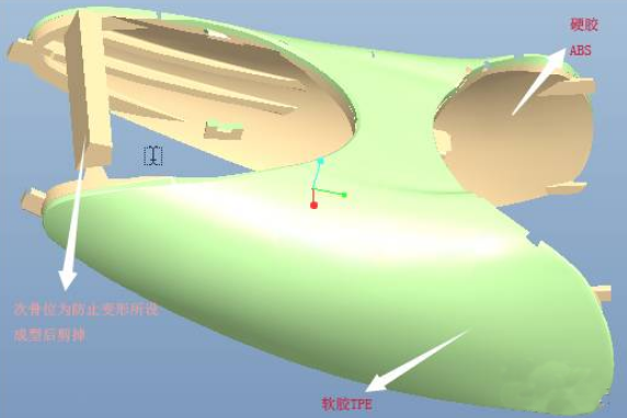 硬膠ABS采用兩點(diǎn)進(jìn)膠,一點(diǎn)位于塑件頂部,成型后被軟膠TPE所覆蓋,另一點(diǎn)在工藝骨位上,最后被剪掉。軟膠TPE一點(diǎn)進(jìn)膠,同樣在塑件的頂部邊緣,成型后產(chǎn)品組裝時(shí)可以被蓋住。